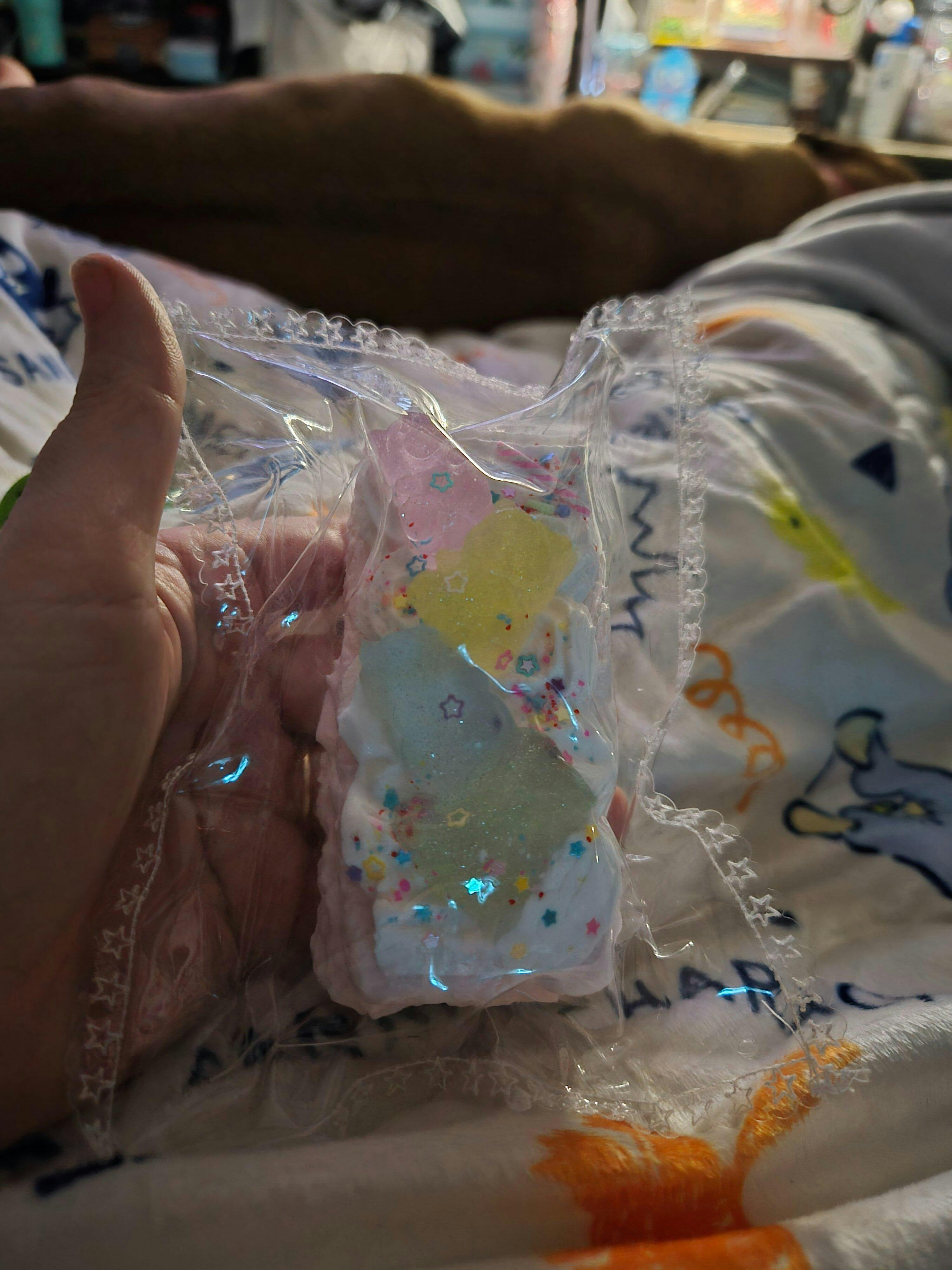 The new Frozen Butter textured tabas are moldable and have a clayish texture. Inside the packaging, it is stiff and hard but slowly rising, you can poke and squeeze it outside the packaging and see the moldable effect, it’s still a taba so it still is able to break and get dirty outside the packaging. It is still extremely sticky like other tabas but if you run it under water or add lotion it won’t be sticky for a while, you can also add baby powder or cornstarch as a permanent way to make it nonstick but it won’t be glossy.